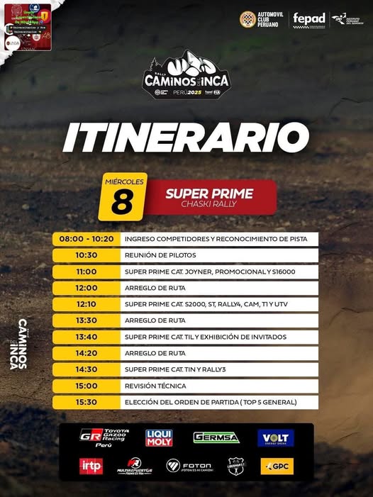 El evento arranca con un Súper Prime hoy 8 de octubre en el autódromo “Chaski Rally”, ubicado en Chilca (km 58 de la Panamericana Sur). Un día después, en Chorrillos, se llevará a cabo la partida simbólica ante el público. Antes, entre el 5 y el 7 de octubre, los competidores deberán pasar las revisiones técnicas y administrativas (que incluyen seguridad, homologaciones y equipamiento obligatorio).