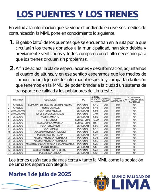 La Municipalidad Metropolitana de Lima (MML) aclaró en un comunicado que los puentes cumplen con las condiciones necesarias de altura para permitir la circulación de los vagones y las locomotoras del tren Lima-Chosica.