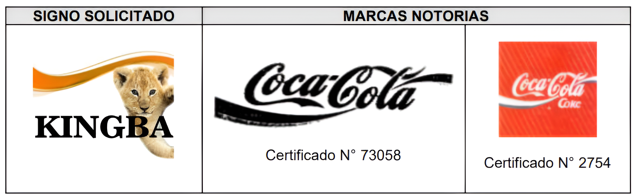 En su revisión, la Sala comparó detalladamente a KINGBA con las marcas COCA-COLA y COKE, inscritas bajo los certificados N.° 73058 y N.° 2754. Concluyó que el signo peruano presenta rasgos propios, tanto gráficos como fonéticos. KINGBA emplea una figura ondulante de colores y la imagen de un felino, mientras que Coca-Cola utiliza su tradicional cinta ondulante con tipografía y colores distintos, lo que evita cualquier riesgo de confusión.