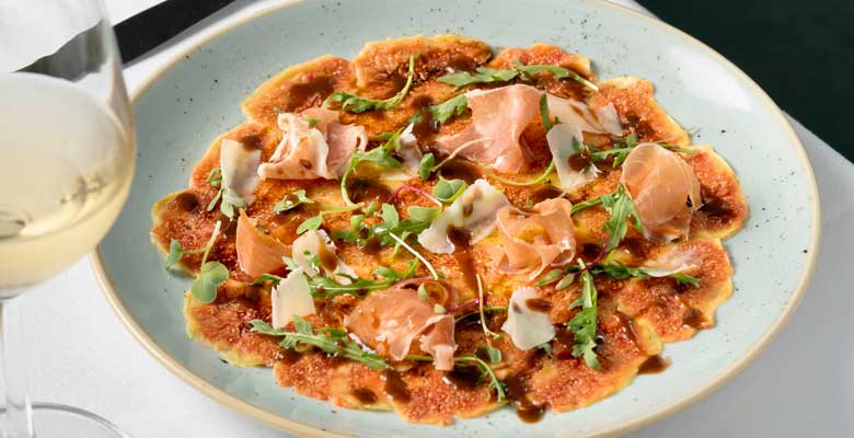 La propuesta inicia con una selección de entradas que realzan la simplicidad y la riqueza de la cocina mediterránea: un Carpaccio de Fichi e Prosciutto, con higos frescos laminados finamente, acompañados de prosciutto, queso Grana Padano, arúgula y un delicado toque de aceite de oliva. También el Polpo a la Grigia, un pulpo a la parrilla con papitas cóctel, portobellos, tomate cherry, aceitunas negras y arúgula, aderezado con perejil fresco.