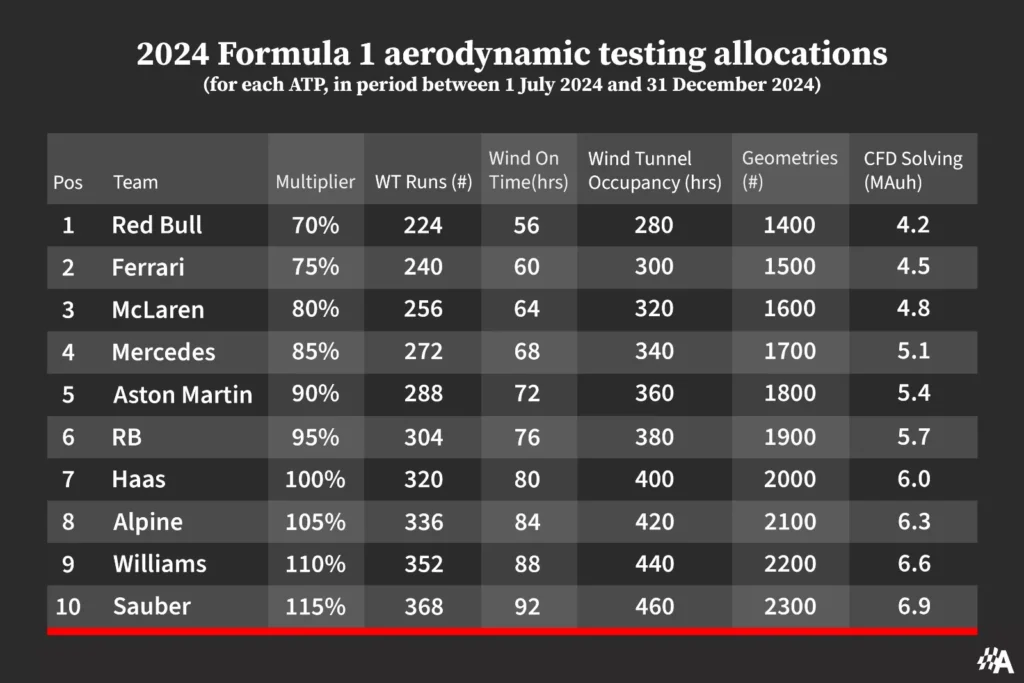 El ATR de la F1 dicta la cantidad de tiempo en el túnel de viento y la capacidad de dinámica de fluidos computacional (CFD) que se puede utilizar para un «período de pruebas aerodinámicas» (ATP) de dos meses, en función de la posición en el campeonato.