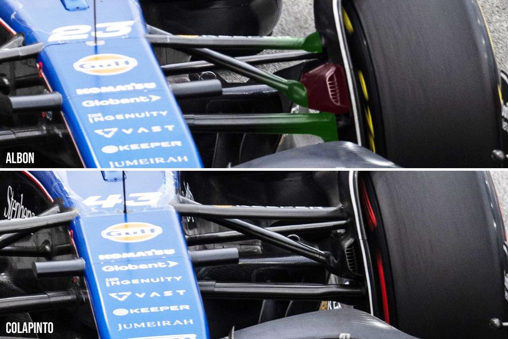 En Singapur, Williams también se presentó con un coche que presentaba varias innovaciones técnicas en el tren delantero, especialmente en la suspensión, completando el paquete que ya había debutado hace unas semanas en Zandvoort. De hecho, el equipo con sede en Grove explicó cómo la revisión de la suspensión tiene dos efectos fundamentales, a saber, reducir el peso y cambiar el patrón de flujo de aire hacia la parte trasera del coche, con el fin de trabajar mejor con las novedades llevadas a Holanda, el paquete más significativo que apareció en el FW46 con el que se revisaron los vientres y el fondo.