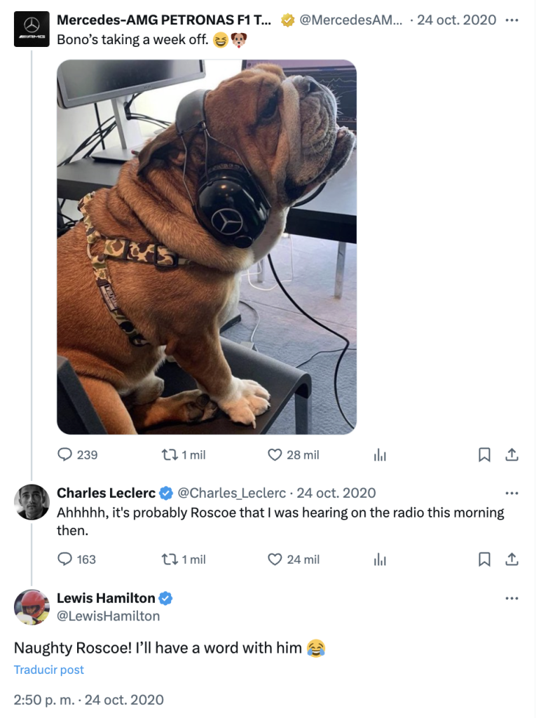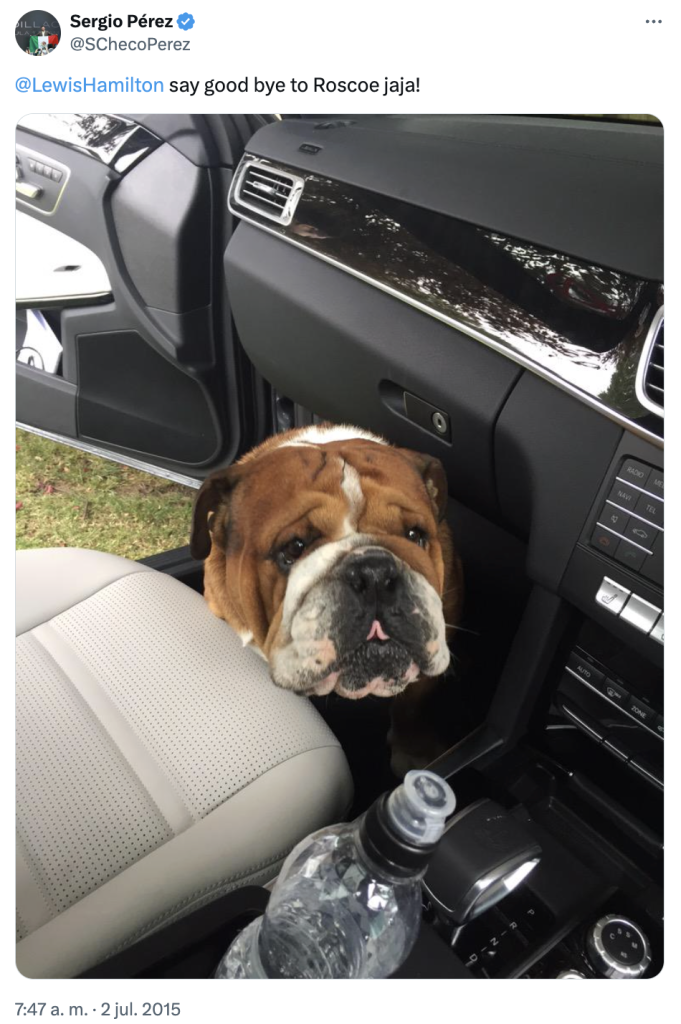 Checo tomó con humor la visita de Roscoe, tanto así que hasta bromeó con Lewis Hamilton y le pidió que despidiera de él. Miren esa carita tan tierna.