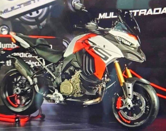 Esas cosas que a veces pasan: a un concesionario se le escapó en redes esta foto que revela una Ducati Multistrada V4 RS. Se trata de una versión radical, al estilo de la Pikes Peak, de la popular maxitrail boloñesa. La foto parece ser tomada del vídeo de una presentación.