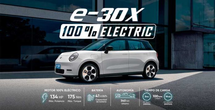 El JAC e-30X integra un motor eléctrico que entrega 134 hp de potencia y 129 Nm de torque, ofreciendo una autonomía de hasta 340 km por carga con su capacidad de batería de 47 kWh.