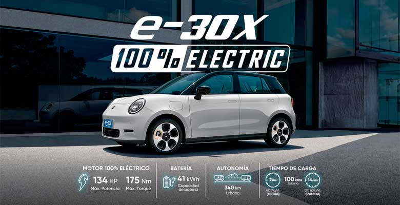 En su interior, el e-30X sorprende con una experiencia completamente digital y funcional. Equipa una pantalla táctil de 12,8 pulgadas, compatible con Apple CarPlay y Android Auto Wireless, conectividad Bluetooth y sistema de navegación avanzada. Este SUV también incorpora una cámara panorámica de 360°, sensores inteligentes, un cuadro de instrumentos digital de 6.2”, y un volante multifunción que permite controlar diversas acciones en la pantalla multimedia. Además, cuenta con cargador inalámbrico y asientos calefactables, mejorando tanto la comodidad como la funcionalidad para los ocupantes.