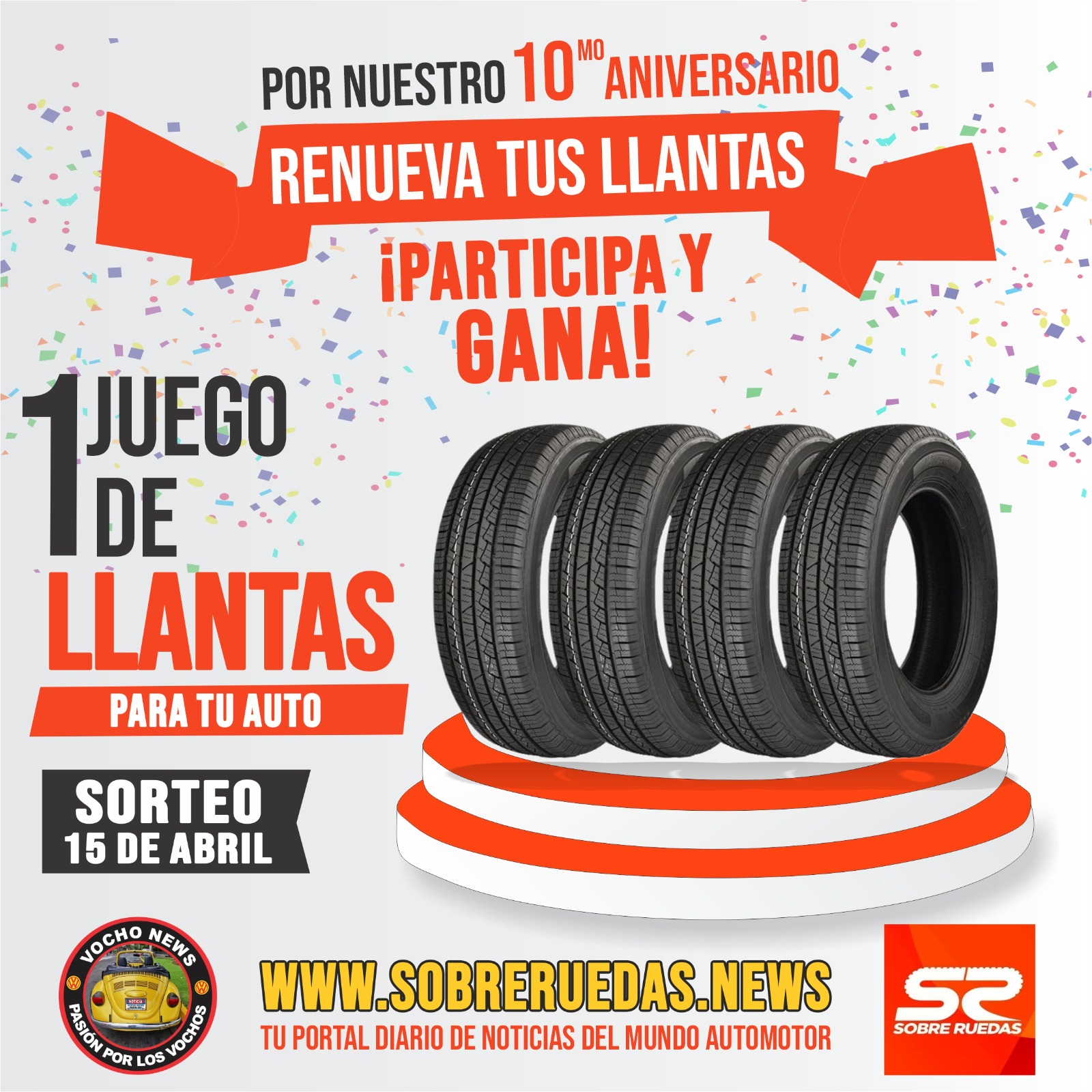 Con motivo de nuestro 10 aniversario, el comité editorial de www.sobreruedas.news sorteará un juego de llantas(4) para tu auto.