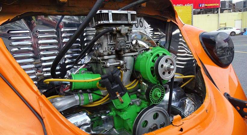 Finalmente, el motor de este vocho modificado es un 1600 con carburador doble centra, kit de cromo completo, radiador de aceite externo y detalles al color de la carrocería.