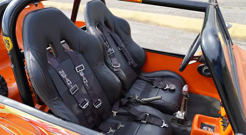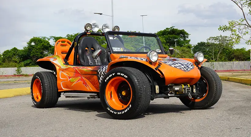 La carrocería de fibra de vidrio completa le da ligereza y un estilo inconfundible, manteniendo la esencia playera y aventurera típica de los buggys clásicos.